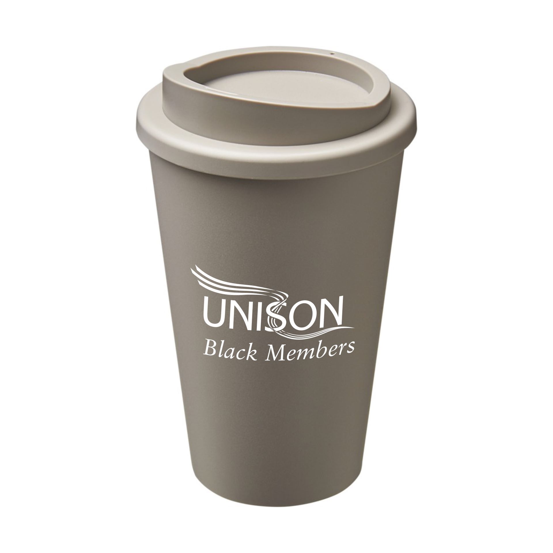 350ml. Double-walled with screw-on lid. Contains 25% plastic derived from sugar cane.The use of sugar cane means less oil is used in the manufacture of each tumbler. 100% recyclable, packed in a home compostable bag. Made in the UK. Printed as shown.