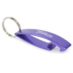 Durable metal bottle opener, includes a silver split ring attachment. Engraved in one position.