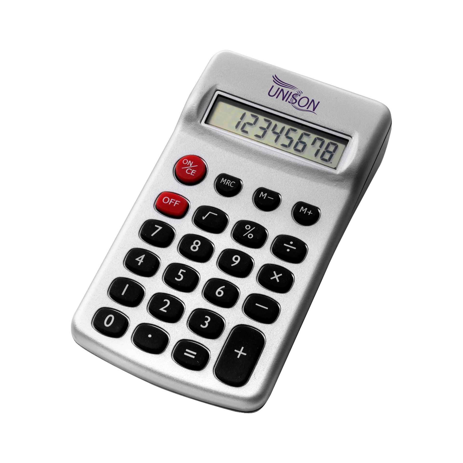 Plastic, LCD, eight-digit calculator. Batteries included. Printed in one colour in one position.