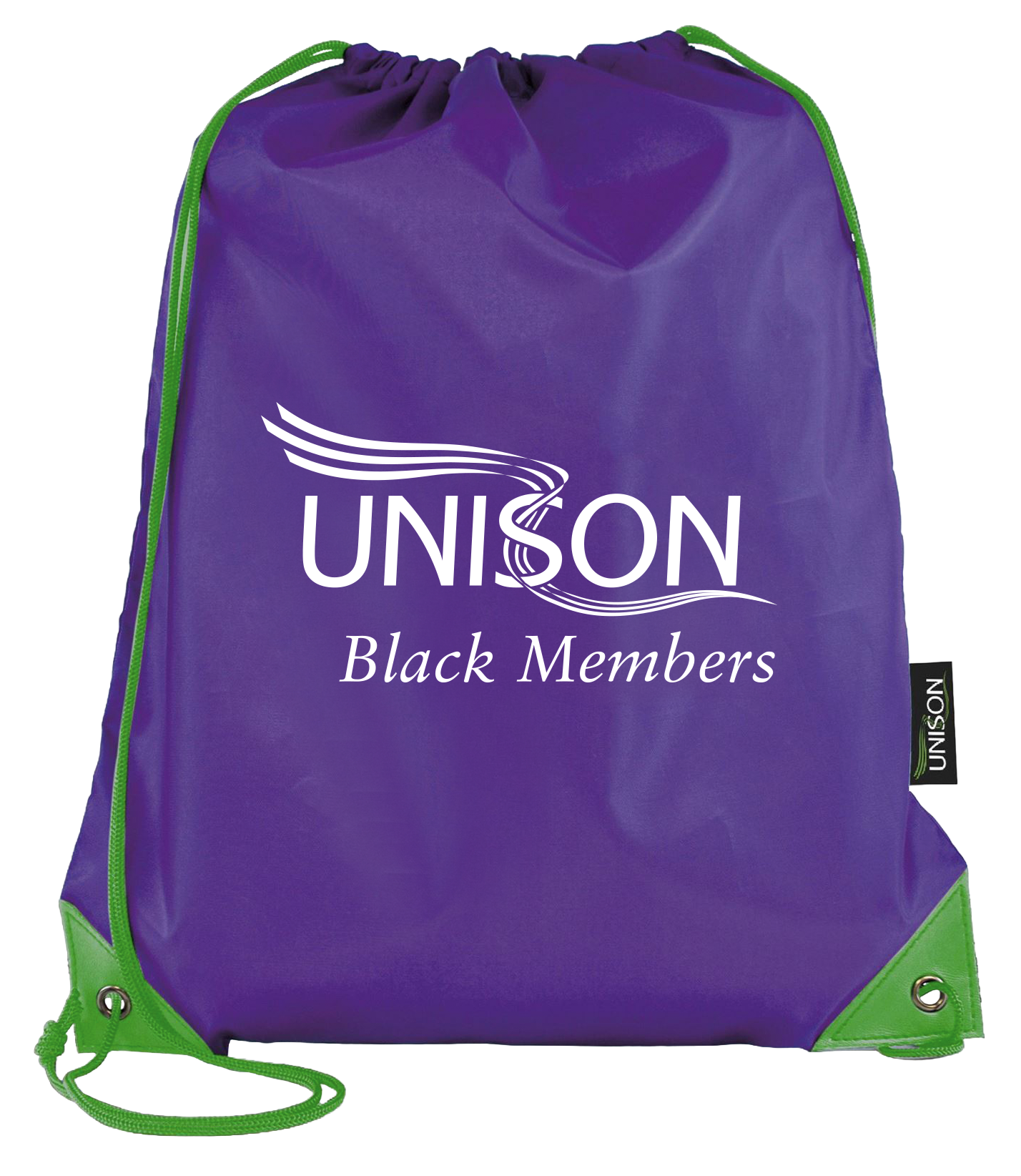 Made from 210d recyclable polyester. Green PU corners and string, UNISON side label. Printed as shown.