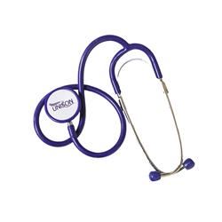 Dual head. Lightweight aluminium diaphragm and bell chest piece construction for wide frequency response. With purple tubing and chestpiece ring. Supplied in individual clear plastic zip top bag. Printed UNISON logo only in purple on the diaphragm.