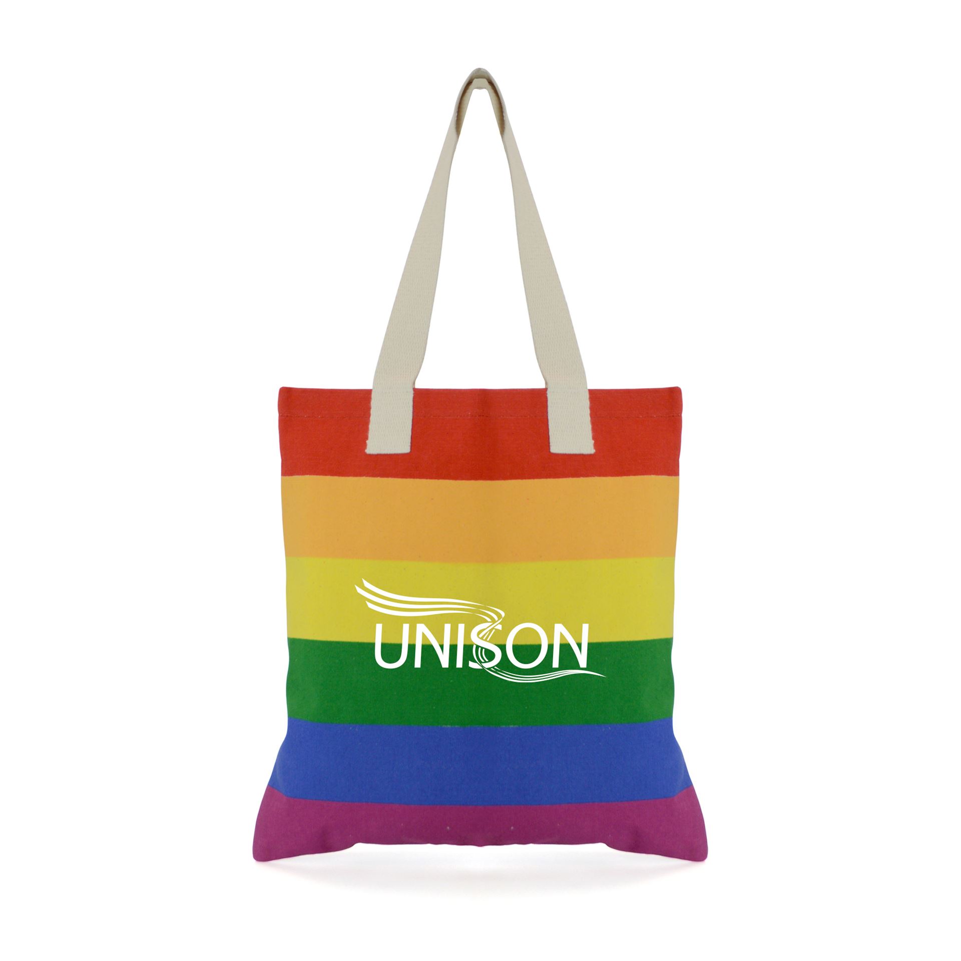 Rainbow striped 10oz canvas shopper with natural, long, cotton webbing handles. Printed in one colour in one position.