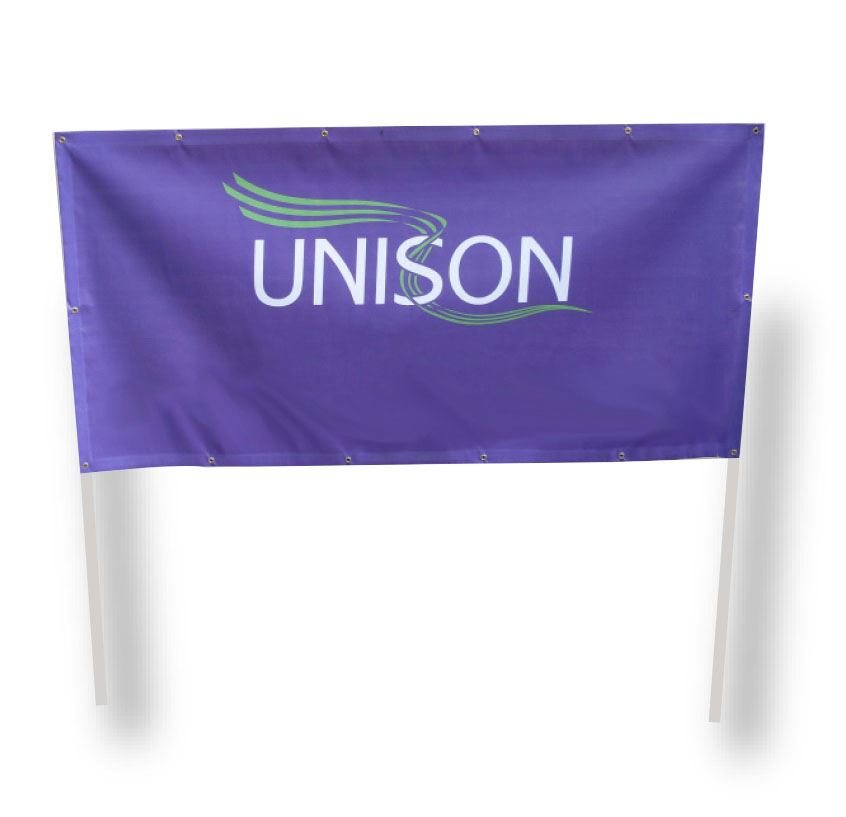 4ft x 6ft. Hemmed and eyeleted, with pole sleeves on both end. Supplied with aluminium poles. Printed in full colour to one side.