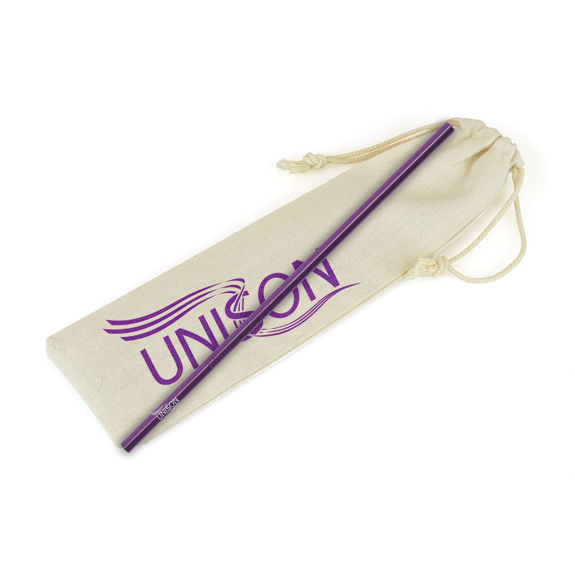 Stainless steel curved straw in purple, with cleaning brush and pouch. Printed in one colour to the pouch only.