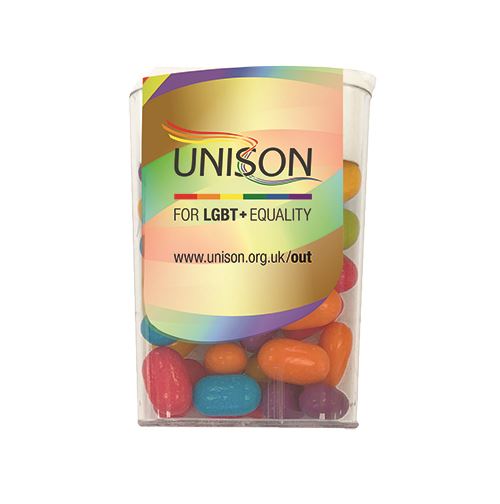 16g flavoured sweets in flip top plastic case. Printed in full colour to label Unison For LGBT+ equality www.unison.org.uk/out