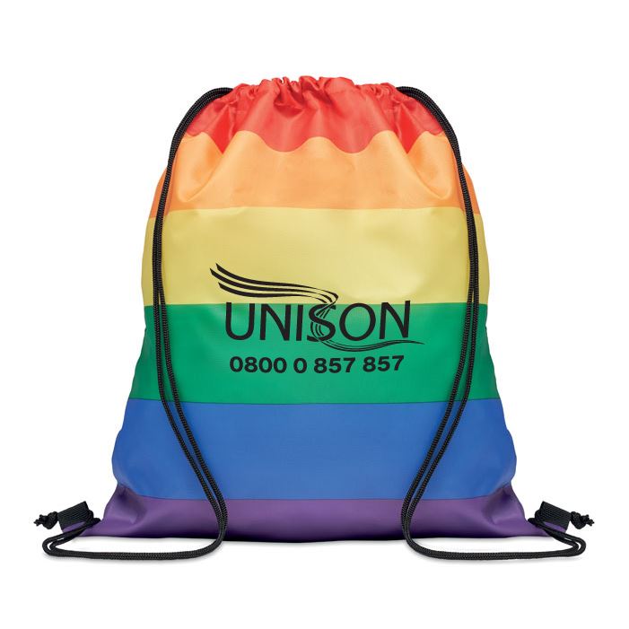 210D polyester drawstring bag with horizontal stripe rainbow coloured print to front and back. Black corners and black string straps. Printed in black to one position UNISON logo and 0800 0 857 857