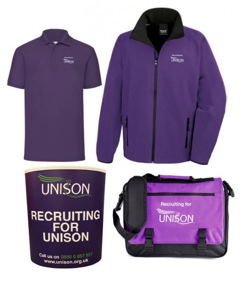 Each pack contains a collapsible, automatic square counter unit, one purple polo shirt, one purple soft shell jacket and one laptop bag, each branded with the wording “Recruiting for UNISON”. No other wording can be added. Please advise clothing sizes. Please note the cost for carriage is £29.