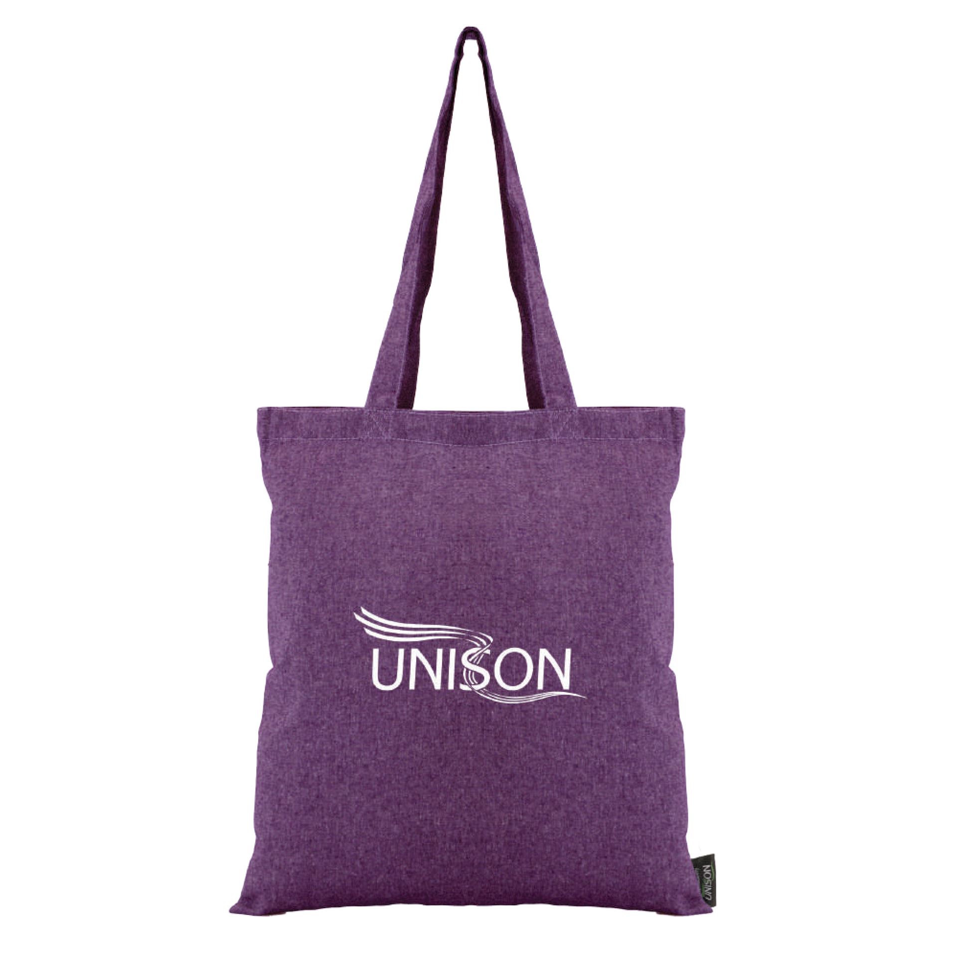 50% recycled 4oz cotton shopper with long handles. GRS compliant. UNISON label sewn into seam. Printed in one colour in one position.