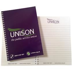 Wiro-bound, 50 sheets per pad, 80gsm white lined paper with purple, green and white cover. Printed with Unison 0800 0 857 857 unison.org.uk to cover and each page