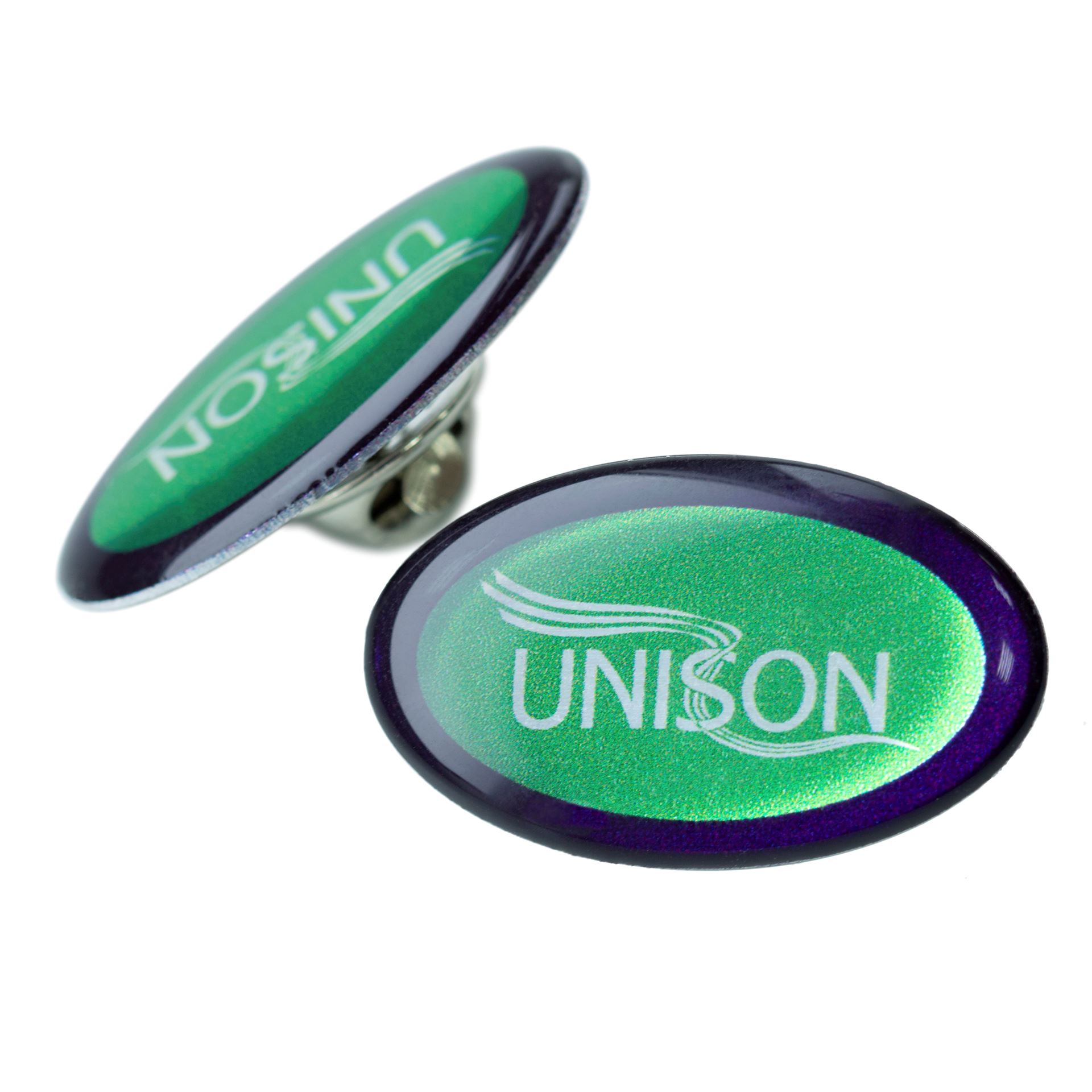 30 x18mm. Silver mirror with clear dome finish. Butterfly clutch pin fitting. Printed in full colour.