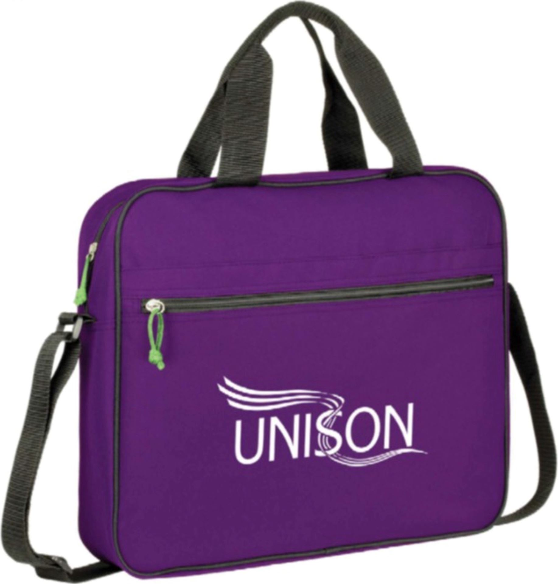 400 x 320 x 80mm. Made in fabric 300x300d rPET. Zipped front pocket, carry handle and adjustable shoulder strap.Pantone matched purple with green pulls. Printed in one colour in one position