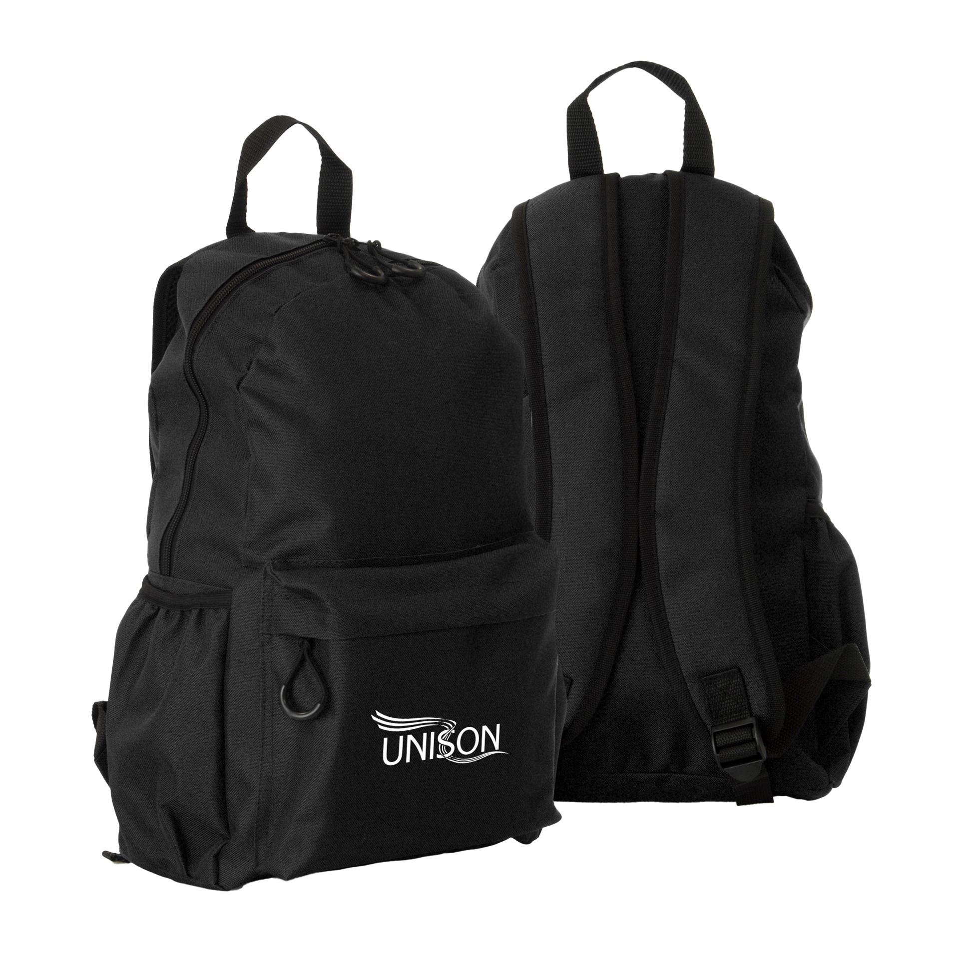 600D rPET backpack with front zipper pocket, two side pockets and padded and curved adjustable shoulder straps. Printed in one colour in one position.