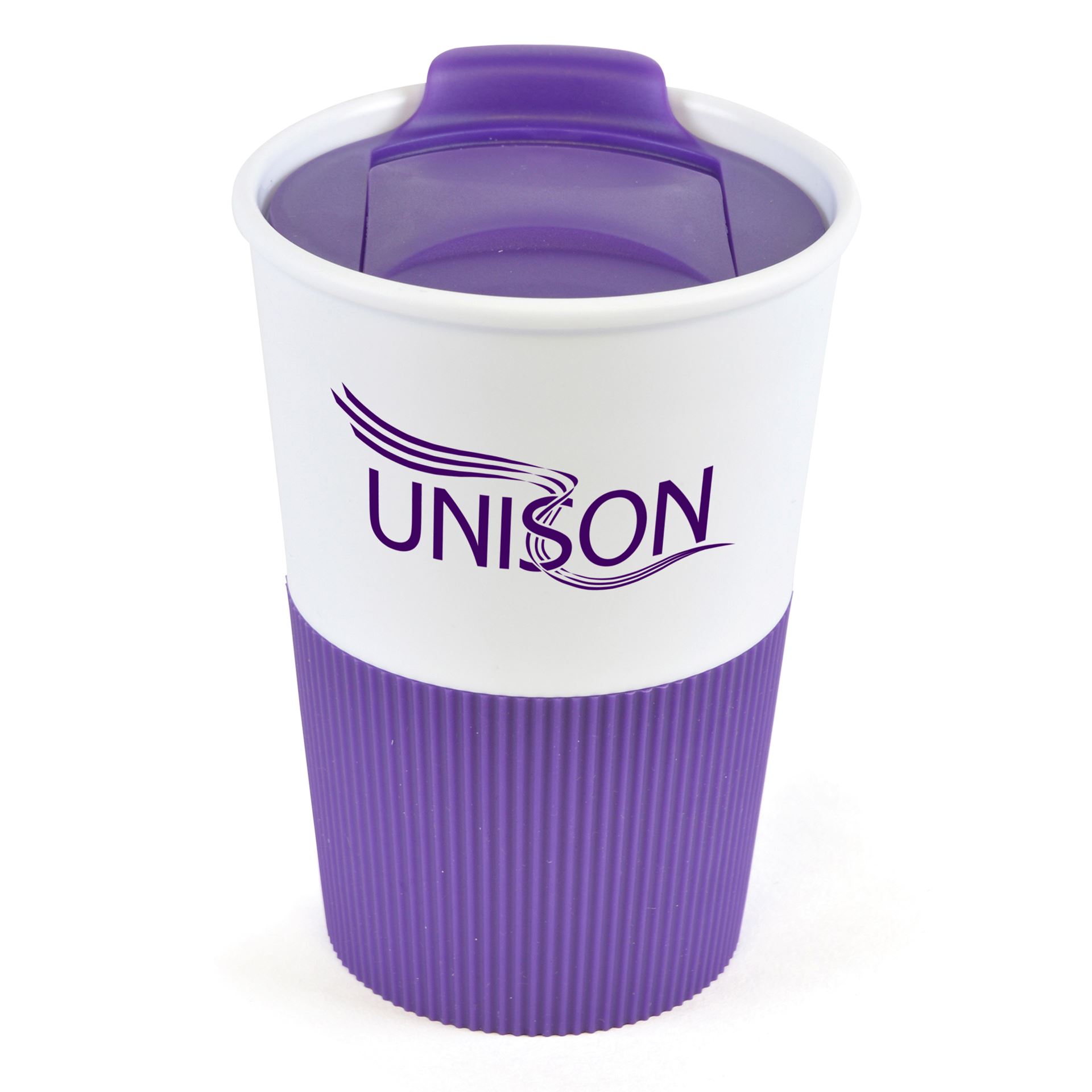350ml plastic tumbler with matching plastic slider lid and rubber grip to the bottom half. BPA & PVC free. Printed in one colour in one position.