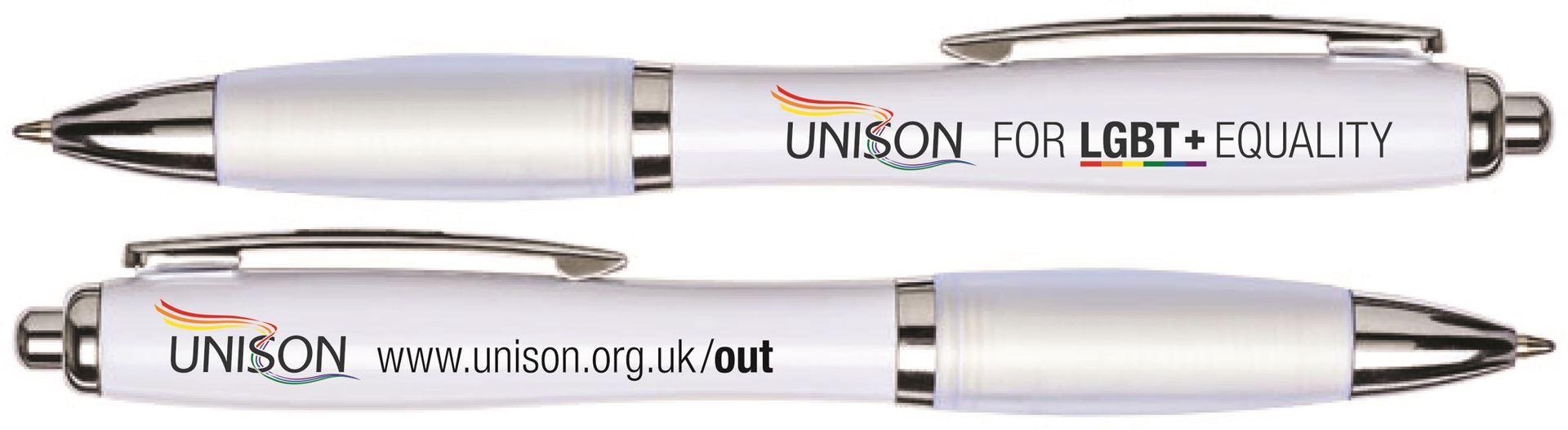 Curvy ballpen in white. Black ink. Digitally printed in full colour to two positions - UNISON For LGBT+ EQUALITY to one side, UNISON www.unison.org.uk/out to other side.