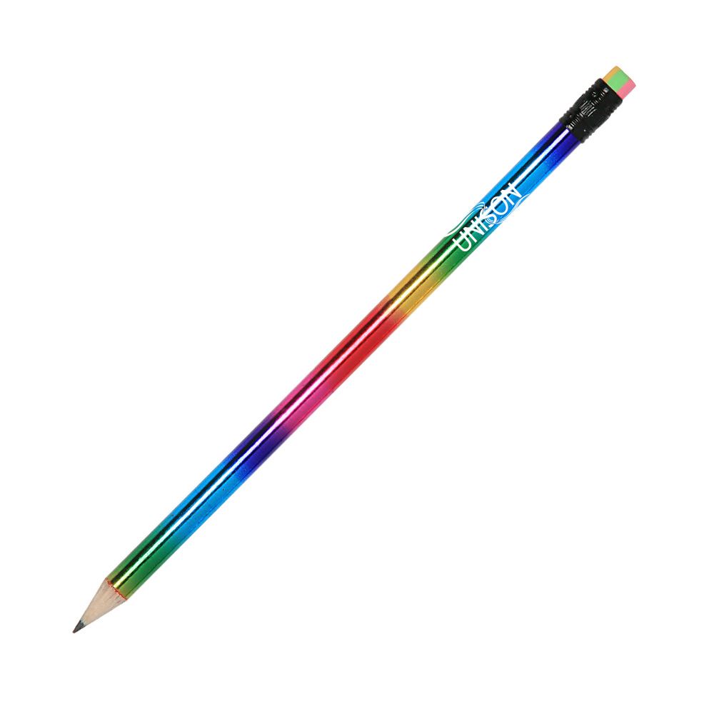 Push action ballpen with rainbow coloured barrel. Printed in one colour in one position.