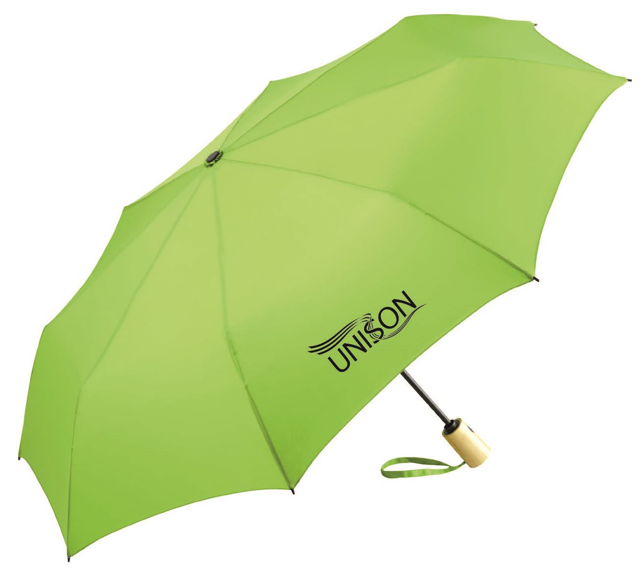 Automatic open/close mini umbrella with cover made of recycled plastics and bamboo handle with black push-button. High-quality windproof system for maximum frame flexibility in stormy conditions. Printed in one colour to one panel.