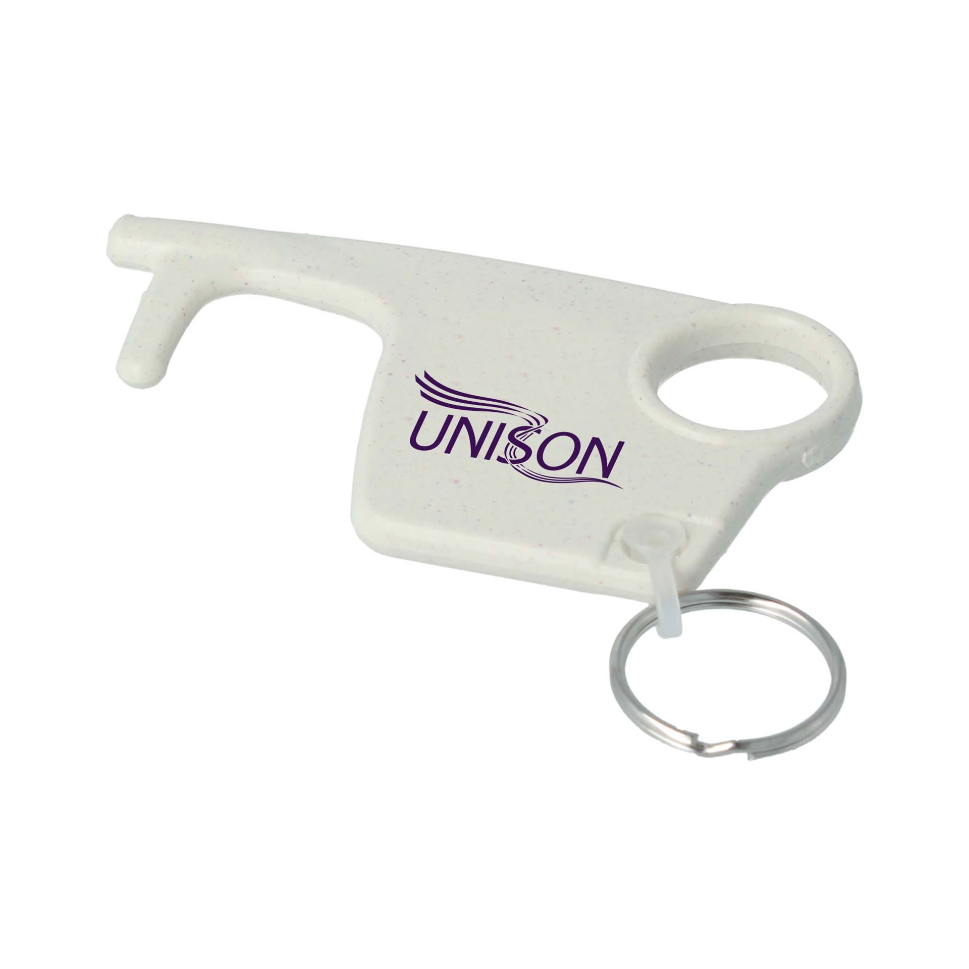 One piece no touch ID card holder features an ID card holder with combined hygiene hook keyring. Made in the UK from 100% recycled plastic. Printed in one colour in one position.