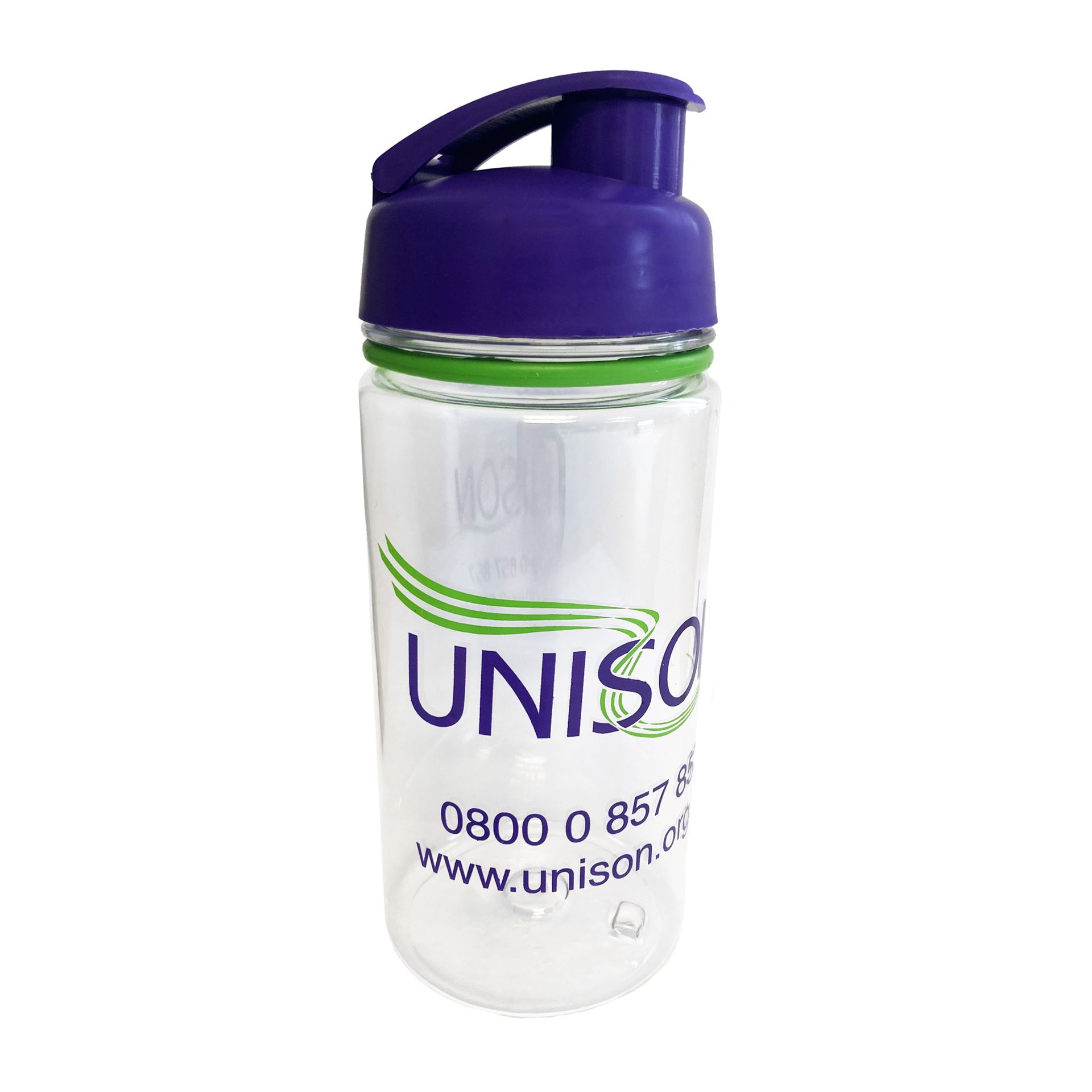 500 ml Tritan sports bottle. Made of 100% Tritan plastic, BPA Free. Purple pantone matched lid with green pantone matched ring. Printed in purple 2627 and green 362 UNISON 0800 0 857 857 unison.org.uk